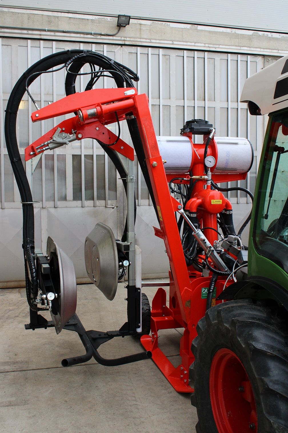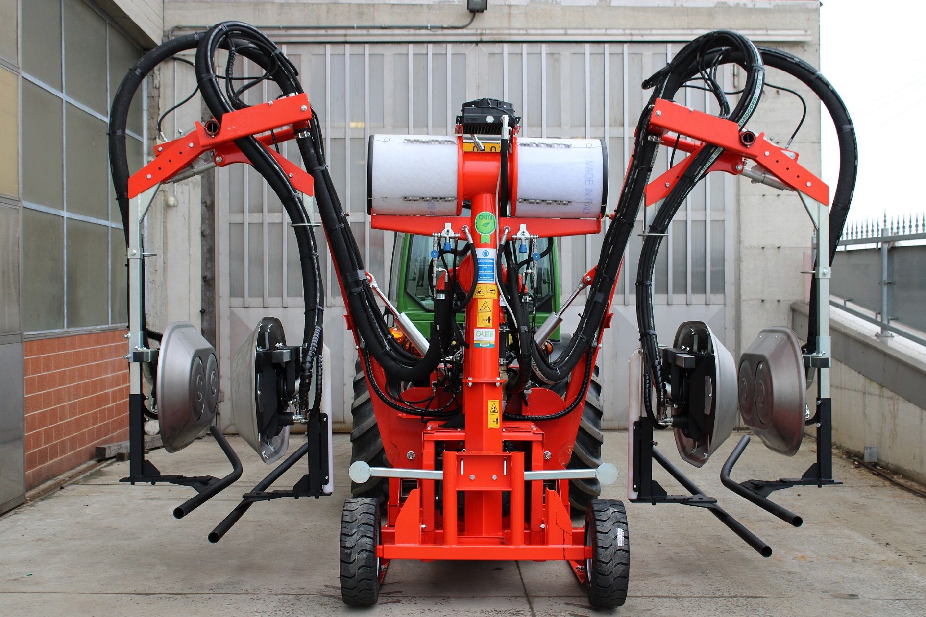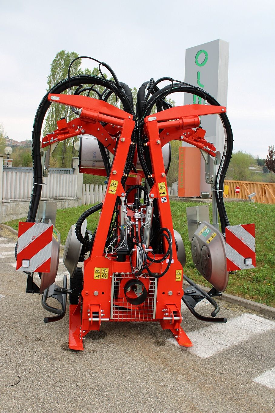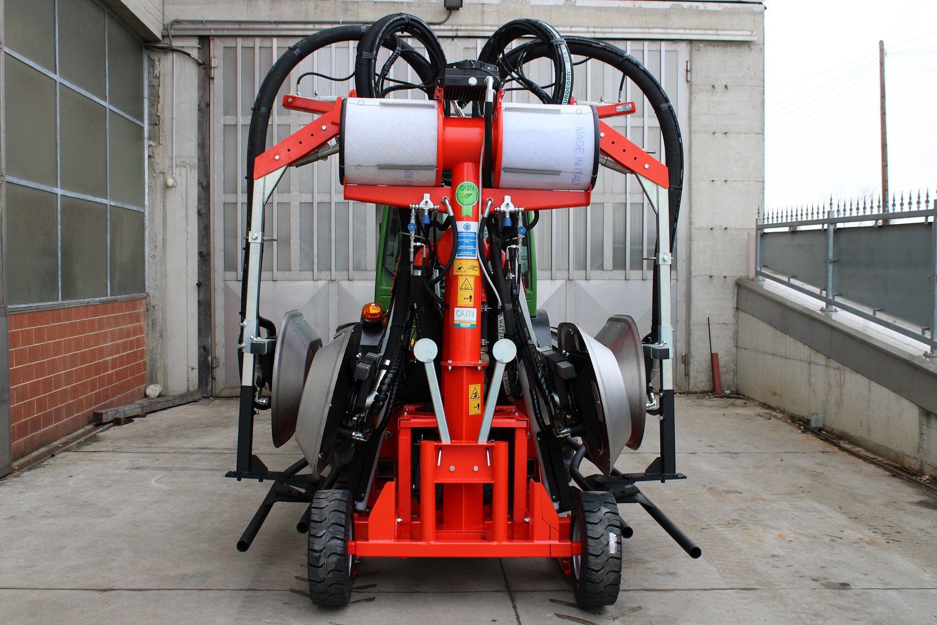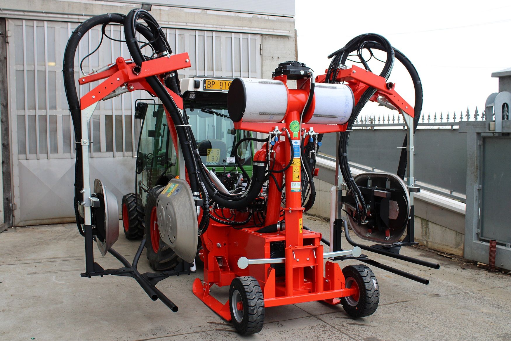 con guide per auto-allineamento alla parete fogliare 6 spostamenti idraulici con joystick elettroidraulico, ruote di appoggio, cardano, attacco a tre punti posteriore – con kit radiatore, possibilità di lavorare solamente su due facciate