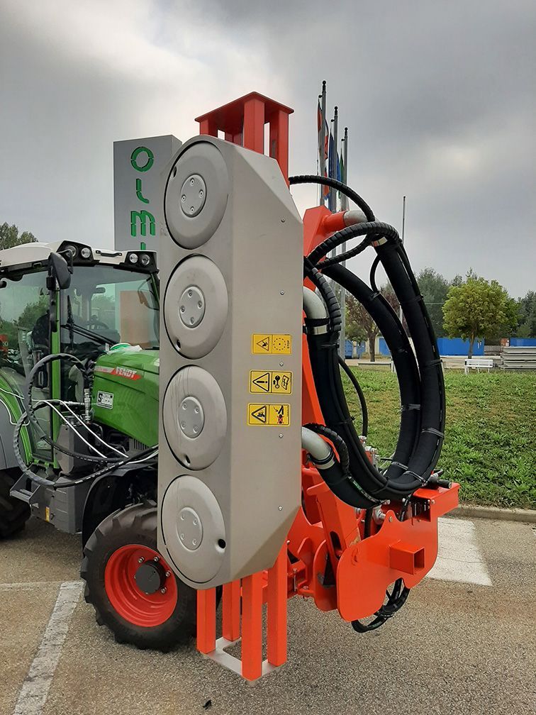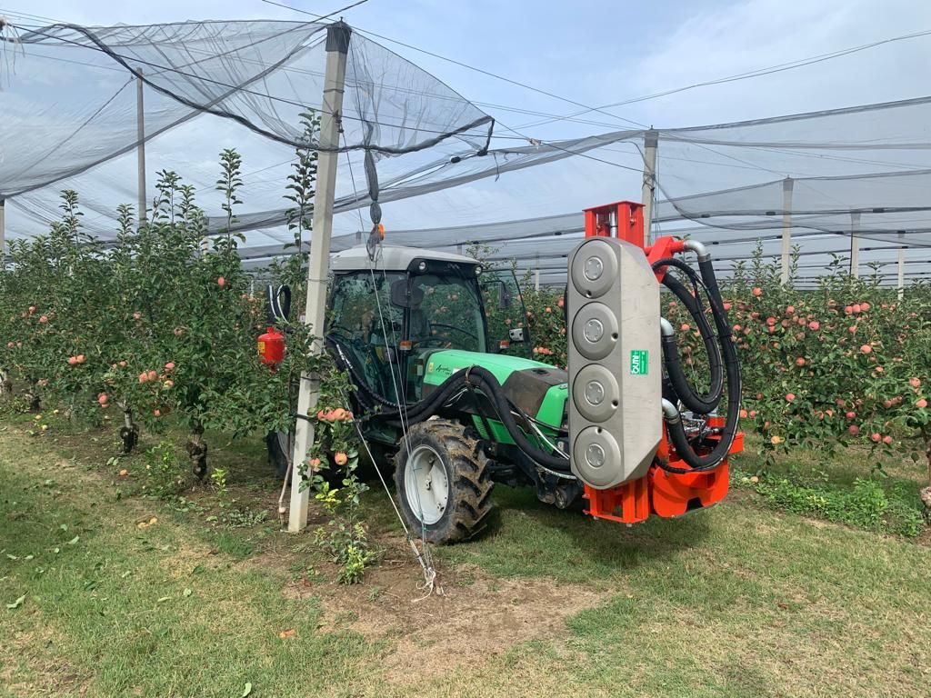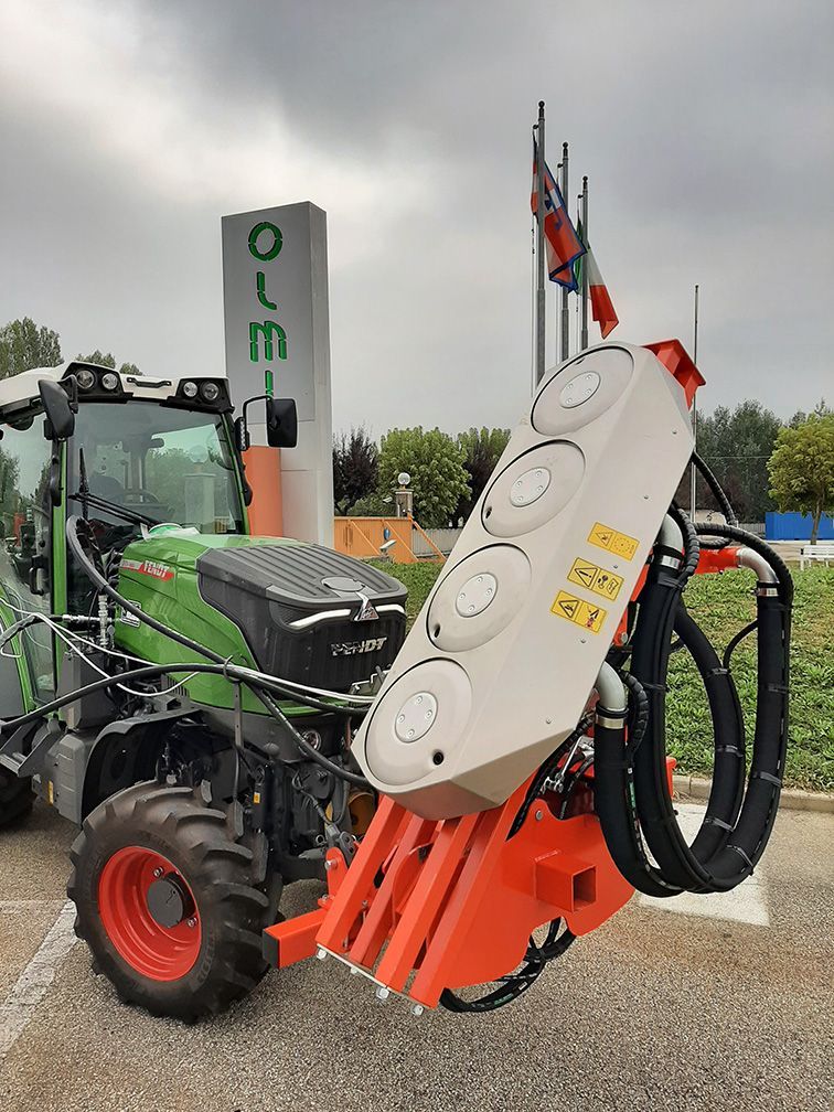 The Olmi deleafer model VORTEX has been designed especially to ensure an effective and targeted removal of the unnecessary leaves in apple orchards, without harming the apple tree. VORTEX is based on the Precision Air Stream Technology, developed in more than 20 years of experience in vineyard deleafing. This system is characterized by the emission of an adjustable low pressure air flow delivered through the rotating disc nozzles.