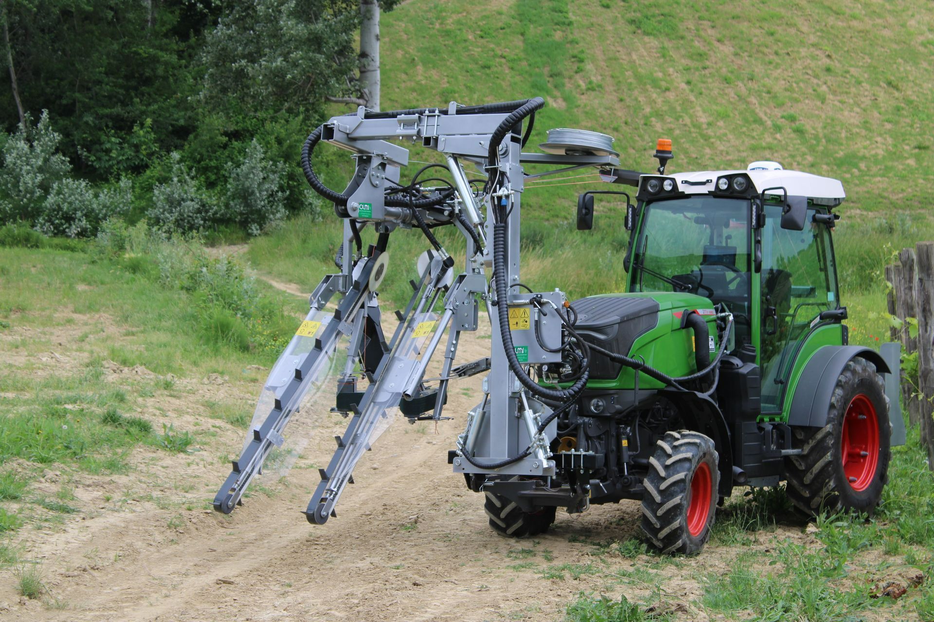 Vine tucking machine, front frame mounted on the tractor, with Electro-hydraulic movements, with metallic wire and rear box for nylon cord.