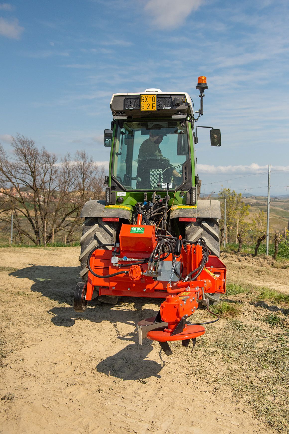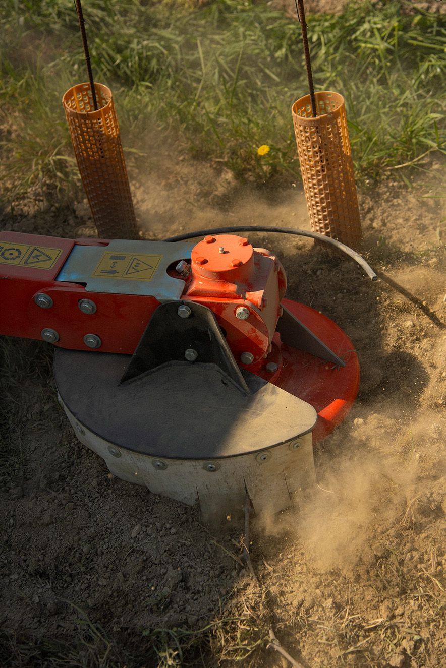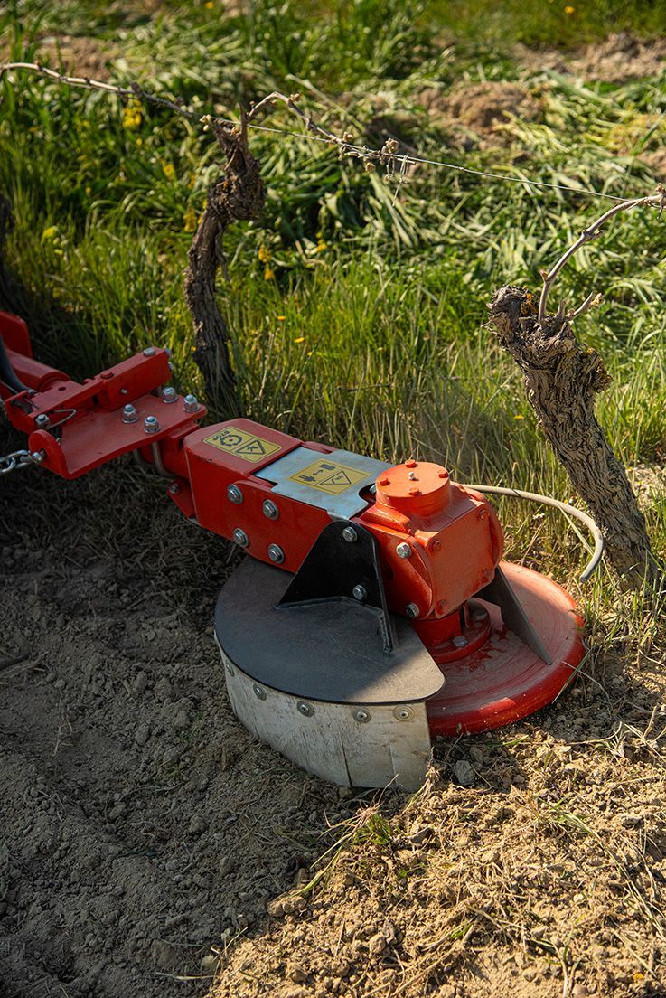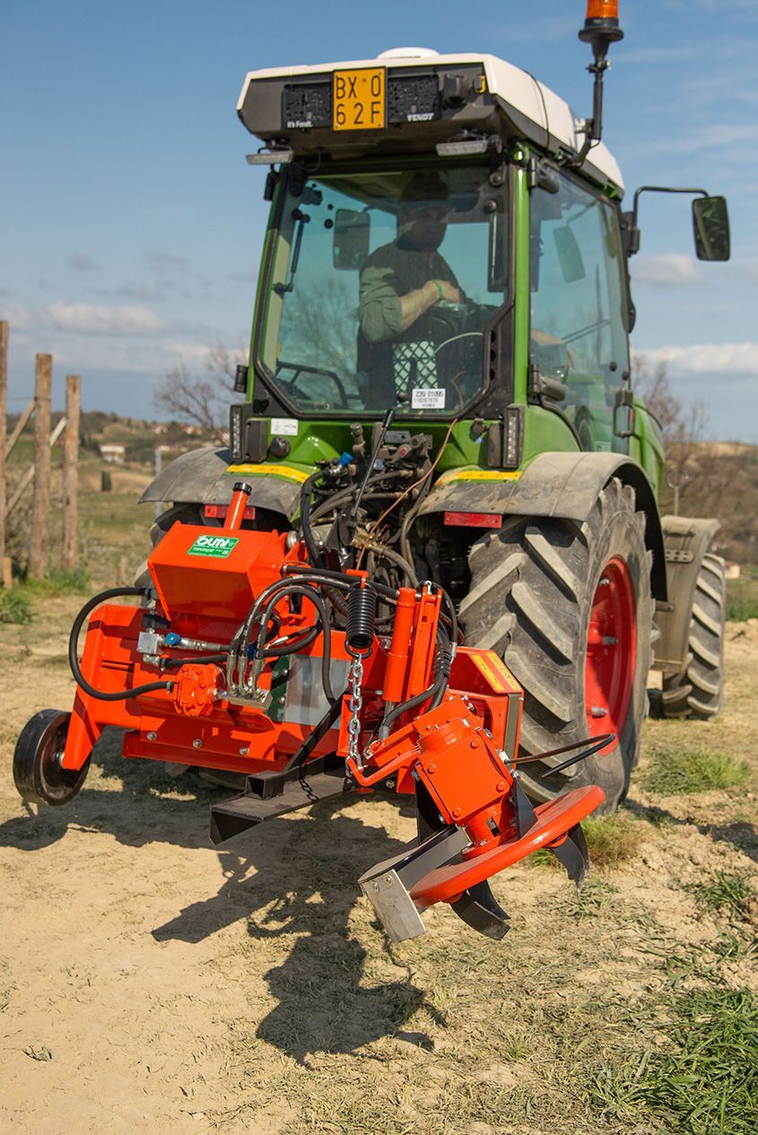 Consente di lavorare in impianti con ceppi molto bassi, senza danneggiare i frutti. Adatta per lavorazioni i collina e in terreno sassosi. Attacco a tre punti al trattore